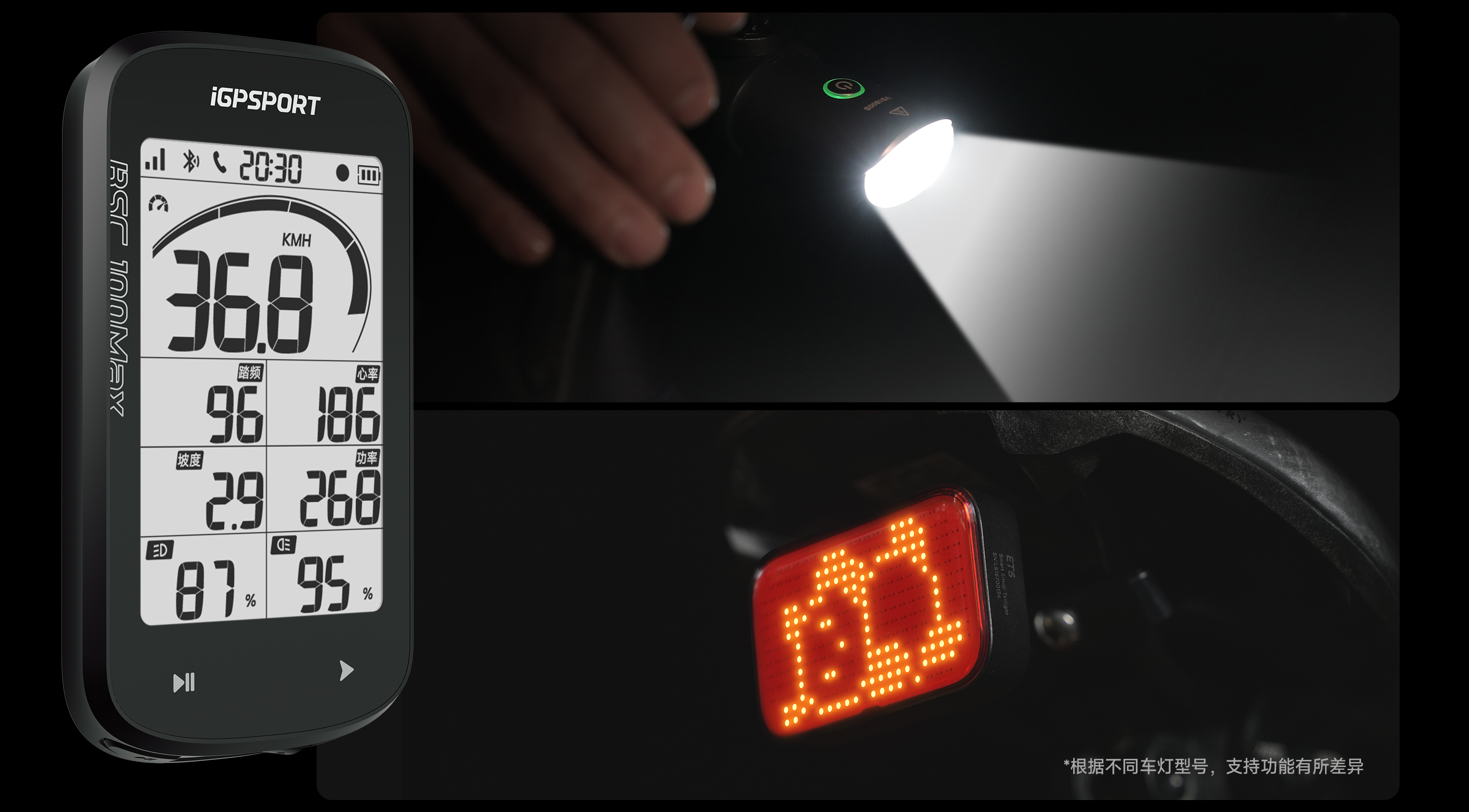 支持iGPSPORT前尾灯连接与控制,可显示车灯电量,一键切换车灯模式、码表同步开关灯等功能*。